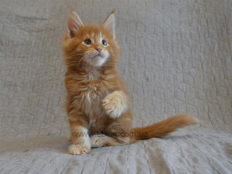 Малыш с ярким окрасом. Спокойный и интеллигентный. Когда играется с братьями и сёстрами, очень аккуратно подкатывает мячик или перебирает лапками. Ласковый, любит спать в кровати.